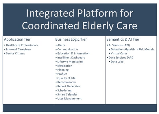 In this paper we present a design and implementation plan for an integrated care platform that builds on an AI and Big Data-enabled and high technology readiness level state-of-the-art personal health framework (PHR-C) [22] to enable shared care plan processes and informal care coordination [23]. PHR-C has been implemented through various research and development projects focusing (amongst others) on the management of pain and stress [24], COVID-19, and cancer [12]. Platform services offer intelligent communication and effective management of interconnections of patients, professionals, and informal caregivers, exploiting advanced AI algorithms to support routine activities. The Elder Care platform extends a personal health record system to support the coordination of care through a shared care plan-focused design.
