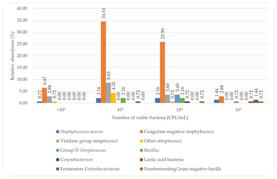 Quantitative results of detected groups of microorganisms in 139 milk samples. The data are presented as a percentage of samples with a certain number of viable bacteria. We found 93.52% of samples without growth of Staphylococcus aureus, 30.22% without coagulase-negative staphylococci, 84.89% without viridans group streptococci, 94.24% without other streptococci, 95.68% without group D Streptococcus, 95.68% without Bacillus, 99.28% without Corynebacterium, 99.28% without lactic acid bacteria, 97.84% without fermenters Enterobacteriaceae, and 98.56% without nonfermenting Gram-negative bacilli (data not shown in figure).