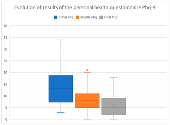 As a whole (n = 39), the average group results were highly positive and evolved steadily (see Figure 1), starting from an initial PHQ-9 of 13.5 (SD = 7.4, range 3–34), improving to 8.3 in the intermediate phase (60 days) (SD = 5.4, range 0–21), and improving again to 6.0 (SD = 5.2, range 0–18) at the end of the message period (120 days). There was a significant difference between the initial and final PHQ-9 value (p = 8.59956 × 10−10). In 38 of the cases (97.4%) the PHQ9 decreased between the initial and final values, while in 1 case it remained unchanged (2.6%).