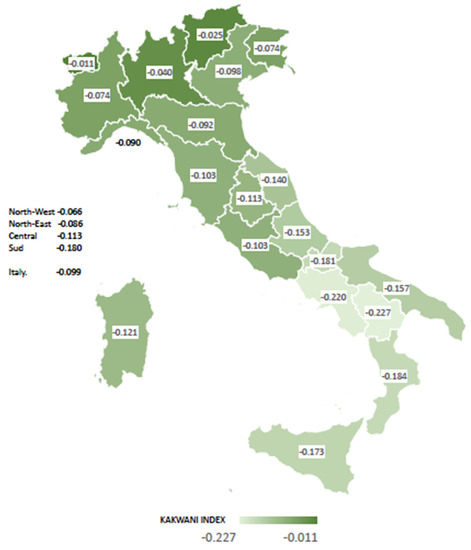 Overall progressivity at national and regional levels—Italy, 2015 (regional weighted Kakwani Index). Source: Authors’ estimates based on Italian National Institute of Statistics household budget survey [25] and IT-SILC survey data [26]. Weighted Kakwani indices. All results are statistically different from zero at the 5% level of significance.