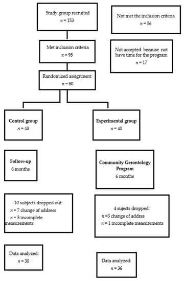 With prior informed consent, an experimental study was carried out in a convenience sample of 80 adults aged 60 to 69 years with a diagnosis of MS without comorbidity (Figure 1). A random assignment was made for the conformation of the two groups of (1) experimental (EG, n = 40) and (2) control (CG, n = 40), during a 6-month period. The EG participated in a supervised community gerontology program (CGP), and the CG participants attended weekly meetings of recreational activities (board games or painting workshop or storytelling) of two hours. The groups were reunited at different schedules to avoid communication between them. All participants were assessed monthly, with anthropometric measurements, blood pressure, and received guidance on healthy lifestyles (diet and physical exercise).