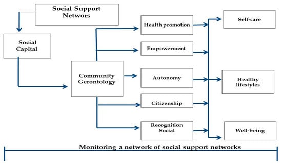 A community strategy for healthy aging is the “peer social support” (PSS), linked to social support networks as a key element of gerontological social capital. In this sense, the PSS implies support between people who share similar experiences, due to their age, health status, and characteristics that allow them to establish a relationship between equals [31], for example, the gerontological nuclei, as proposed in our community program of gerontology. In this regard, positive results have been reported in community social support programs among peers for the control of diabetes mellitus in adults, where four main elements of peer support required by adults with diabetes will be found: (1) exchange of experiences, (2) cohesion and collectivity, (3) trust and reciprocity, and (4) social participation [32,33].