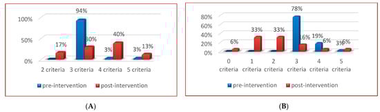 Figure 3. Percentage of the number of MS criteria pre and post-intervention. In (A) (control group) pre-intervention, 28/30 (94%) subjects had 3 MS criteria, 1/30 (3%) had 4 MS criteria, and 1/30 (3%) had 5 MS criteria; post-intervention, 5/30 subjects (17%) changed from 3 to 2 MS criteria, 28/30 (94%) changed to 9/30 (30%) with 3 MS criteria, 1/30 (3%) changed to 12/30 (40%) with 4 MS criteria and 1/30 (3%) changed to 4/30 (13%) with 5 MS criteria. In (B) (experimental group), pre-intervention 28/36 (78%) subjects had 3 MS criteria, 7/36 (19%) had 4 MS criteria, and 1/36 (3%) had 5 MS criteria; post-intervention, 2/36 subjects (6%) changed from 3 to 0 MS criteria, 12/36 (33%) changed from 3 to 1 MS criteria, 12/36 (33%) changed from 3 to 2 MS criteria, 28/36 (78%) changed to 6/36 (16%) 3 MS criteria, 7/36 (19%) changed to 2/36 (6%) with 4 MS criteria, and 1/36 (3%) changed to 2/36 (6%) with 5 MS criteria. Therefore, 25/30 (83%) of the control group, in comparison with 10/36 (28%) of the experimental group, maintained a diagnosis of MS (3 or more components) after the intervention, whose difference was statistically significant (p < 0.001); (A) control group; (B) experimental group.