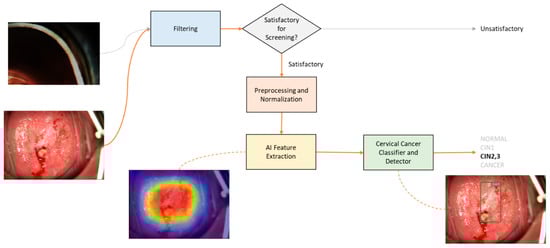 A diagram of Cerviray AI® interpretation for colposcopic images. The system assesses the visibility of the images, and recognizes the squamocolumnar junction and transformation zone of the uterine cervix. If the image is satisfactory for evaluation, the image is processed and normalized for AI feature extraction. This is followed by the classification of images according to the AI impression.