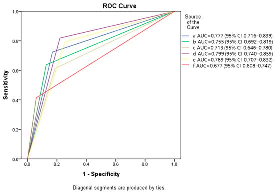 ROC curves of each diagnostic performance for detecting high-grade or worse lesion versus less severe impressions. (a) AI interpretation; (b) colposcopic impression of Dr 1; (c) colposcopic impression of Dr 2; (d) combined impression of AI and Dr1 colposcopy; (e) combined impression of AI and Dr2 colposcopy; (f) cytology.