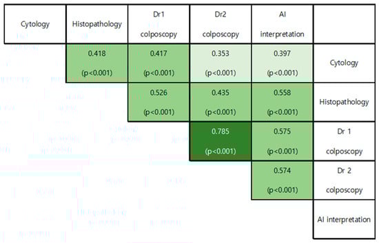 Figure 3 presents the correlation coefficients for each diagnostic tool. Doctors 1 and 2 demonstrated the highest correlation coefficients. However, cytology demonstrated a generally low correlation with other diagnostic tools.