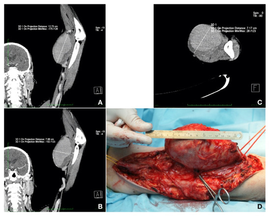 Case 2. A 42-year-old patient presented with a pulsatile mass in the upper left arm, with a skin erosion and the loss of the grip strength, also known to have chronic renal disease stage 5 KDIGO and Alport syndrome, and having undergone a live-donor RT 8 years prior. The patient had palpable radial and ulnar pulses. He had, on the same arm, a radio-cephalic AVF, closed 6 years before with radial artery reconstruction and cephalic vein thrombosis. He was on immunosuppressive and steroid agents (mycophenolic acid 2 × 180 mg and prednisone 5 mg daily). He underwent a CT-Angio investigation that showed a brachial artery aneurysm of 14.69/6.49 cm. The patient did not require hemodialysis after the investigation because the level of creatinine was constant at 4 mg/dL at 48 and 72 h after the investigation, respectively. Furthermore, for this patient, aneurysm resection and vascular reconstruction were performed. The patient received preoperatively an adjusted dose of Vancomycin® (Fresenius Kabi, Brasov, Romania) at 1 g/dosage for infection prevention. Aneurysm resection and reconstruction with a collagen-impregnated woven nylon graft (Dacron®; Vascutek, Terumo) of 10 mm in diameter and end-to-end anastomosis with 6.0 Prolene® (BBraun, Hessen, Germany) continuous sutures were performed under general anesthesia. This vascular graft was chosen due to the arterial diameter (more than 10 mm), arterial wall thickness (approximately 2 mm and anfractuous structure), and because the saphenous vein of the patient was not fit for the procedure (1.5 mm in diameter, as previously measured by ultrasound). The postoperative evolution was without complications on the surgical site (embolic, neurological, bleeding, or infection at the surgical site). A week after the vascular reconstruction, the patient developed constrictive pericarditis and needed a pericardial window. Two months after surgery, the patient developed a chronic rejection of the transplanted kidney and required nephrectomy. The status of the patient deteriorated rapidly, and he died 3 months after reconstruction (Figure 3).