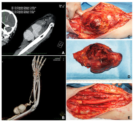 (A,B) MIP thin collection and volume rendering technique (VRT) CT-Angio showing the 2D dimensions of the giant aneurysm. On the VRT image, one can observe the bad quality of the radial artery and the calcified aspect of both run-off vessels distal to the aneurysm. (C) Intraoperative image with the aneurysm dissection. (D) Resected aneurysm with mural thrombosis. (E) Vascular reconstruction with 10 mm Dacron graft interposition and spatulated, end-to-end anastomosis with Prolene 6.0 continuous sutures (personal collection).