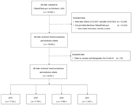 ClinicalTrials.gov website was searched using the word “Cancer” in the study results field and concurrently searched with synonyms, “neoplasm”, “tumor”, “malignancy”, “oncology”, “neoplasia”, “neoplastic syndrome”, and “neoplastic disease”, which were downloaded with all matching records as excel and XML files, and all relevant data are publicly available at www.clinicaltrials.gov (accessed on 18 October 2020). As one of primary registries of the WHO trial platform, providing more than 120,000 clinical research studies conducted in more than 175 countries, clinical trial information provided by ClinicalTrials.gov was downloaded [17]. To obtain standardized or consistent information on clinical trials, data from ClinicalTrials.gov were analyzed for the comprehensive understanding of oncology trials [18].