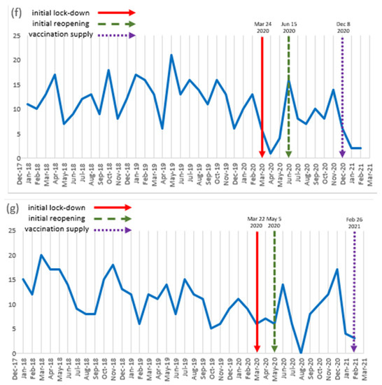 Monthly trends in the commencement of new oncology trials according to countries from 2018 to 2020. (a) United States; (b) China; (c) France; (d) Canada; (e) Italy; (f) United Kingdom; and (g) Korea.