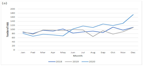 The number of trials was different based on funding sources, such as industry (19%), academia (18%), or government (1.2%) in March 2020, which showed an increased number of trials funded by the government (2%) and academia (1%) in June 2020, but other trial numbers were shown to be decreased in the same month, such as those funded by other organizations or those that were cofunded (Figure 4). The number of drug intervention trials showed similar trends to the previous two years (2018 and 2019) and presented an increased number of trials after the pandemic declaration compared to the previous years (Figure 5).