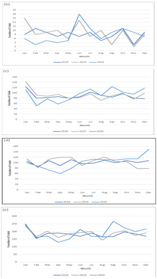 Monthly trends in the commencement of new oncology trials according to funding source from 2018 to 2020. (a) Industry; (b) government; (c) other; (d) academia; and (e) cofunded.
