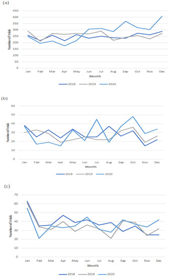 Monthly trends in the commencement of new oncology trials according to type of interventions from 2018 to 2020. (a) Drug; (b) device; and (c) procedure.