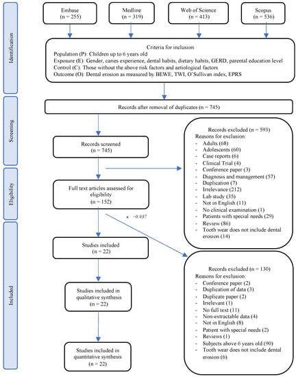 - Studies (S): observational studies, such as cohort, case–control, and cross-sectional studies on the prevalence and risk factors of erosive tooth wear in children up to 7 years of age with full texts written in English.