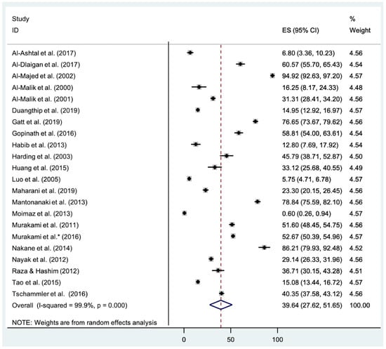 All twenty-two studies contributed to the meta-analysis on the prevalence of dental caries [,,,,,,,,,,,,,,,,,,,,,]. The estimated combined prevalence of erosive tooth wear in children below 7 years old is 39.64% (95% CI: 27.62, 51.65), as seen from Figure 2. There was significant heterogeneity across the studies, with I2 of 99.9%, and p < 0.001. As more than 10 studies contributed to this overall estimate, Begg’s and Egger’s tests were used to check for publication bias. Begg’s and Egger’s tests showed no significant bias (p = 0.866 (continuity corrected), p = 0.444, respectively). Following a GRADE recommendation, the body of evidence was downgraded to a very low quality of evidence due to the data being observational and having substantial inconsistency regarding heterogeneity across the studies (Table 3). A sensitivity analysis showed that the omission of any of the included studies did not significantly affect the results.