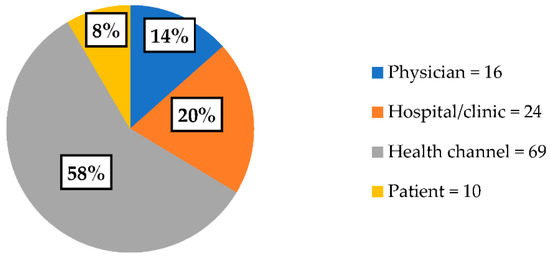 The largest number of videos were provided by health channels (n = 69), followed by hospital/clinic channels (n = 24), physicians (n = 16), and patients (n = 10) (Figure 2). The DISCERN results were compared between video providers, showing lower DISCERN quality of health channel videos than hospital/clinic channel videos (p < 0.05).