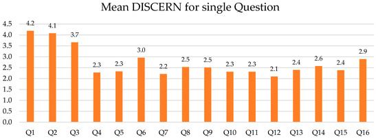 The mean DISCERN score was 35.6 (range 19.2–62), with a median of 33.8 (±9.2). The overall mean DISCERN score for each question (Q) was 2.73. For the GQS scale, the mean score was 2.4 (range 1–4), the median 2.4, and std 0.7. For JAMA, the mean score was 1.8 (range 1–4), the median 1.5, and std 0.7. The mean DISCERN scores for each Q are presented in Figure 4.