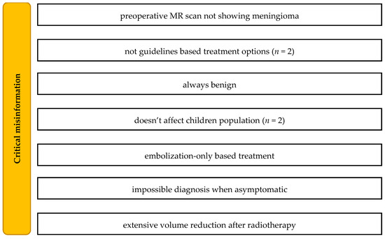 Misinformation on the origin of meningiomas was present in 11 productions. Nine productions included over- or under-estimated epidemiological data. Five videos presented misinformation on vocabulary (e.g., “metastatetic”) and WHO classification errors (e.g., WHO 4 meningioma and “WHO 1–5 grades”). One video presented an improper surgical technique. Nine cases of critical errors were detected, and are presented in Figure 6.