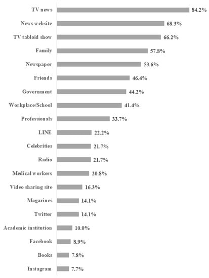 In the public health viewpoint, our result suggested that “medical workers”, “professionals”, “the government”, “Twitter”, “news website”, and “TV news” were positively associated with compliance with multiple preventive behaviors. These information sources play an important role in providing beneficial information for preventing COVID-19. However, not all people received information from these information sources. Therefore, developing a strategy of increasing access to these sources or media may increase compliance for preventive behavior against COVID-19. Our descriptive results also suggest that the proportion of usage of each information source differed by sociodemographic and socioeconomic status. It may also be important to consider which information source is most effective in providing beneficial information to a specific population.