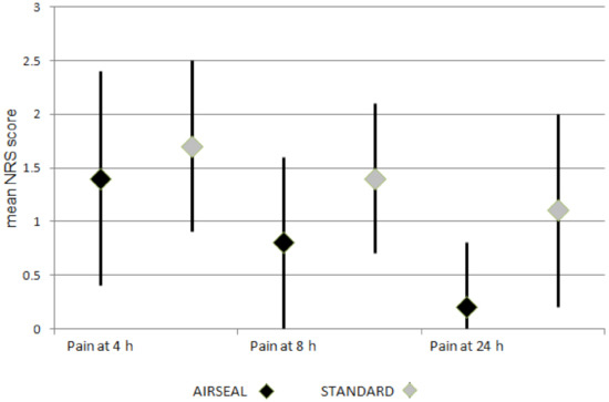NRS pain control score of the two groups at 4, 8 and 24 h after surgery.