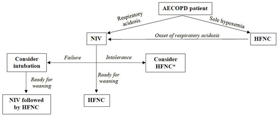 Despite these tricks, NIV may encounter failure due to poor comfort and patient tolerance. In this scenario, HFNC plays its role as an alternative treatment for AECOPD patients [55]. It should be strengthened that HFNC could be applied only in case of NIV intolerance [56,57,58,59], and if the gas exchange or clinical conditions are not worsening, otherwise intubation should be considered [2].