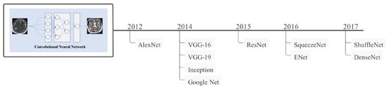 Convolutional neural networks (CNNs) are a subclass of artificial neural networks (ANNs) that are extensively used in image processing. CNN is widely employed in face identification, text analysis, human organ localization, and biological image detection or recognition [24]. Since the initial development of CNN in 1989, a different type of CNN has been proposed that has performed exceptionally well in disease diagnosis over the last three decades. A CNN architecture comprises three parts: input layer, hidden layer, and output layer. The intermediate levels of any feedforward network are known as hidden layers, and the number of hidden layers varies depending on the type of architecture. Convolutions are performed in hidden layers, which contain dot products of the convolution kernel with the input matrix. Each convolutional layer provides feature maps used as input by the subsequent layers. Following the concealed layer are more layers, such as pooling and fully connected layers [21]. Several CNN models have been proposed throughout the years, and the most extensively used and popular CNN models are shown in Figure 2.