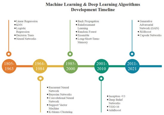 In general, it may be considered that ML and DL have grown substantially throughout the years. The increased computational capability of computers and the enormous number of data available inspire academics and practitioners to employ ML/DL more efficiently. A schematic overview of machine learning and deep learning algorithms and their development chronology is shown in Figure 3, which may be a helpful resource for future researchers and practitioner.