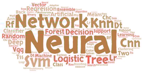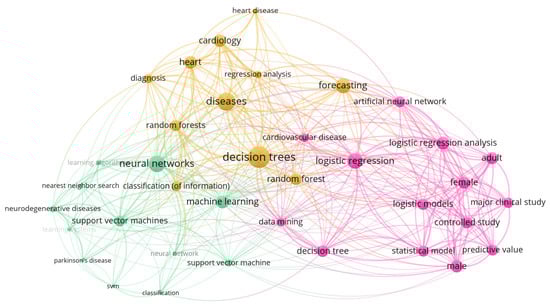 Co-occurrence of keywords provides an overview of how the keywords are interconnected or used by the researchers. Figure 6 displays the co-occurrence network of the article’s keywords and their connection, developed by VOSviewer software. The figure shows that some of the significant clusters include neural networks (NN), decision trees (DT), machine learning (ML), and logistic regression (LR). Each cluster is also connected with other keywords that fall under that category. For instance, the NN cluster contains support vector machine (SVM), Parkinson’s disease, and classification.
