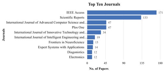 We investigated the most prolific journals in MLBDD domains based on our referred literature.The top ten journals and the number of articles published in the last ten years are depicted in Figure 8. IEEE Access and Scientific Reports are the most productive journals that published 171 and 133 MLBDD articles, respectively.