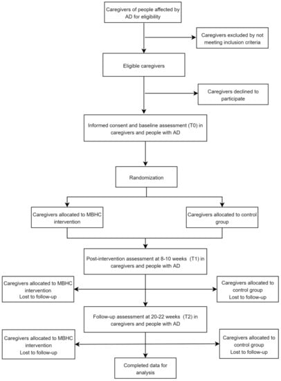 The ATENción plena en Enfermedad de Alzheimer (ATENEA—Mindfulness in Alzheimer’s disease; http://inteo.edu.umh.es/en/atenea/) project is a randomized, single-blind, parallel group clinical trial for caregivers of AD patients. This trial will include an intervention group that will attend a Mindfulness-Based Health Care (MBHC) program and a control group that will continue with their usual routine. Participants will be caregivers of people diagnosed with mild cognitive impairment due to AD or dementia due to probable AD according to the criteria of the National Institute on Aging and the Alzheimer’s Association (NIA-AA) [23]. The participant assessments of both caregivers and people with AD will be carried out in person. Three assessments will be conducted: at the beginning of the study (baseline assessment T0), at the end of the program at 8–10 weeks (post-intervention assessment T1), and 20–22 weeks after the start of the study (follow-up assessment T2). Figure 1 summarizes the flow chart of the ATENEA project.