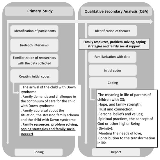 This is a qualitative secondary analysis (QSA) of the research project “Family and individual adjustment in Brazilian families living with children and adolescents with Down Syndrome” [29,30,31,32]. The QSA refers to using existing data collected for a different research work [33], allowing a new perspective or look at the original data. An analytic expansion of QSA was used in this study [34]. In the primary study, the spirituality of families of children with DS was not the focus of the interviews. However, participants presented consistent information about this theme, especially when talking about social support, problem solving, and coping strategies. From a qualitative perspective, this information was considered important in the life context of families living with a child with DS and a secondary research question was defined aiming at this specific theme. The primary data were useful in asking new or emerging questions derived from the initial research question. This QSA was subsequent and the time from the primary study to this end has brought opportunities for new insights to researchers, which is described as an advantage of this procedure [35].