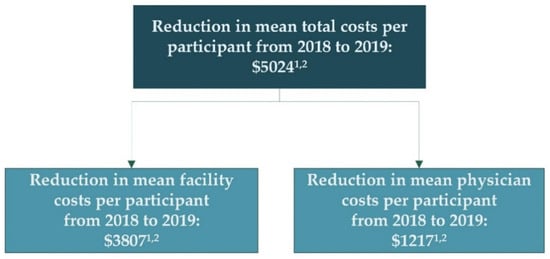 As shown in Table 4, the mean total medical costs (i.e., combined facility and physician) increased from 2018 to 2019 in both cohorts, but the increase was smaller for the MRM cohort. Specifically, the MRM group’s costs increased by a mean of USD 4386 (95% CI, USD 3040–5732) per participant, whereas the control group’s costs increased by USD 9410 (95% CI, USD 7737–11,084) per participant. This USD 5024 difference between each group’s year-over-year change was significant (p < 0.001); therefore, PACE organizations using MRM consumed USD 5024 less per participant from 2018 to 2019 relative to control. As depicted in Figure 2, 75.7% (USD 3807/USD 5024) of this reduction was related to facility expenditures. As shown in Table 4, both facility and physician expenditures increased less in the MRM cohort (p < 0.001).