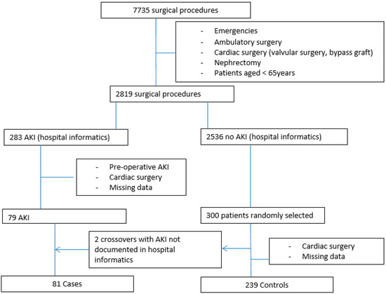 Patients in the hospital’s computer database with a diagnostic code indicating AKI in addition to a surgical intervention between 1 January and 31 December 2015 were identified as cases. Controls were randomly selected from the database for those aged over 65 years who underwent surgery during the study period to those who had no diagnostic code for AKI. The flowchart of the study population is shown in Figure 1. A total of 300 controls were selected to ensure that there would be at least one control for each case. Cases and controls were not matched because this would have excluded the matching variable from subsequent statistical analysis. Potential matching variables such as age, sex and type of surgery being potential predictors of AKI were, however, included in the analysis. Controls were selected randomly using a specific computer program. The initial data extraction was performed using Cpage software (Cpage Company, Dijon, France).