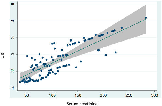 Odds ratios for post-operative acute kidney injury according to pre-operative serum creatinine levels.