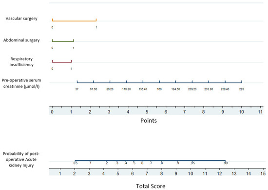 In this study, the focus on older patients undergoing surgery, above normal pre-operative serum creatinine levels, with a history of respiratory disease and abdominal surgery and/or vascular surgery were all associated with an increased risk of post-operative AKI. However, older age did not have an impact on risk of post-operative AKI. A nomogram that attributes points to each of these factors may yield a total score that predicts post-operative AKI and may allow for one to quickly trigger kidney protection for patients at risk.