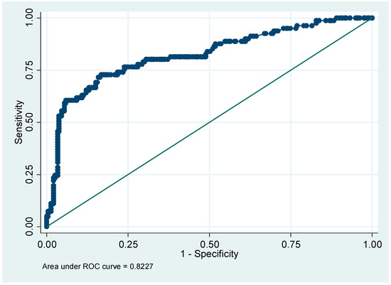 By multivariate analysis, four factors were found to be associated with an increased risk of post-operative AKI, namely, pre-operative serum creatinine (p = 0.0001), a history of respiratory disease (p = 0.04), abdominal surgery (p = 0.03) and vascular surgery (p = 0.001). Using the factors identified by multivariate analysis, a nomogram was drawn (Figure 3), indicating the number of points associated with each risk factor and the probability of post-operative AKI associated with each value across the range of the total score. Figure 4 presents the ROC curve produced by the internal validation procedure with an area under the curve of 0.82.