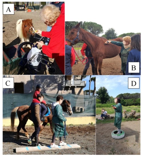The ET program included ten 45-min-long sessions that took place twice a week. Before starting full activities with the horse, they were required to carry out activities of daily life and to report on how things went; such activities included wearing single-use overalls, changing shoes, and sanitizing hands. The next step was organizing the setting according to the characteristics of each participant, such as physical ability. The new setting was introduced at the first session, and this was followed by the approach and knowledge of the horse that, through the therapist’s mediation, allowed for the establishment of a relationship based on trust and mutual understanding between participant and horse. The activities included: