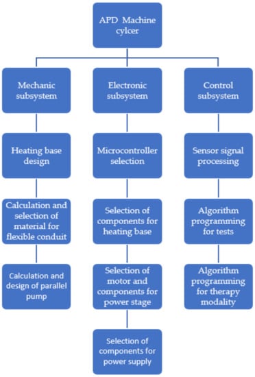 There are two treatments for patients with chronic renal failure: kidney transplant or dialysis. The second has two variants, hemodialysis (HD) and peritoneal dialysis (PD). The objective of both procedures is the same; eliminate the uremic toxins with different molecular weights in the blood [5,6]. However, the performance for each therapy is different; data collected by institutions such as the Mexican Institute of Social Security (IMMS) and the Institute of Security and Social Services for State Workers (ISSSTE) indicate that HD allocates 52.6% to costs per treatment and 39% to complications. In comparison, PD allocates 54.6% of the total cost of care to complications and 36.3% to supplies (bag, cassette, line change) [7]. However, peritoneal dialysis demands a therapy with a wide margin of improvement. In that sense, adjustments to the design of the medical equipment known as a cycler are constantly being developed. A machine for APD administers and prepares the optimal conditions for the dialysis fluid for delivery to reach to the peritoneal cavity. Each therapy performs three work cycles, infusion, permanence, and drain. The pumps transfer dialysate fluid at 35 °C to the peritoneal cavity during the infusion without overfilling. There is an exchange between the blood and the dialyzing solution during the permanence. In addition, through the pump, the main dosing bag is replenished to raise its temperature later. Ultrafiltration (metabolic waste) and infused fluid are removed from the peritoneum in the drainage. Throughout the cycle, the volumetric precision, temperature, flow, and speed are monitored for any irregularity. This is indicated with alarms. Therefore, it is important to select each device that composes the machine [8,9].