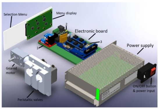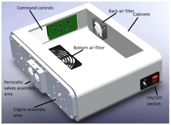 The cabinet of the APD machine is set up with different parts shown in Figure 2; the cabinet supports all the elements, followed by the power supply section of the machine, which is connected through a power cable NEMA 15 splitter. Next, there is an air filter at the back of the machine, which will allow airflow through the machine without introducing unwanted elements. Then, at the bottom, there is another machine’s air filter. The LCD screen and the machine’s controller are on the left side. Next, there are the plates on which the motors and the peristaltic pumps are mounted, and finally, the valves are in the cabinet directly.