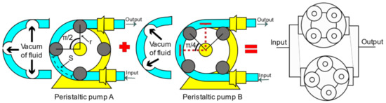 The design of the parallel peristaltic pump seeks to combine the output pulses generated by the arrangement of 4 separate rollers for both pumps; in addition, there is a phase difference of between pump A and pump B to reduce flow and pressure fluctuations at the outlet. The flow combination is interpreted with Equation (4).