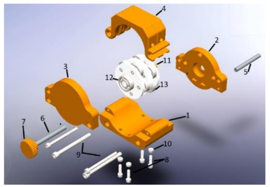 Peristaltic pump structure: (1) Lower casing, (2) Clamping, (3) Back casing, (4) Hose holder housing, (5) Hinge axis, (6) Safety bolt axis, (7) Safety bolt, (8) Socket head screw M4 × 12, (9) Socket head screw M4 × 16, (10) Nut M4, (11) Union stem, (12) Adjusting bearing, (13) Rollers.