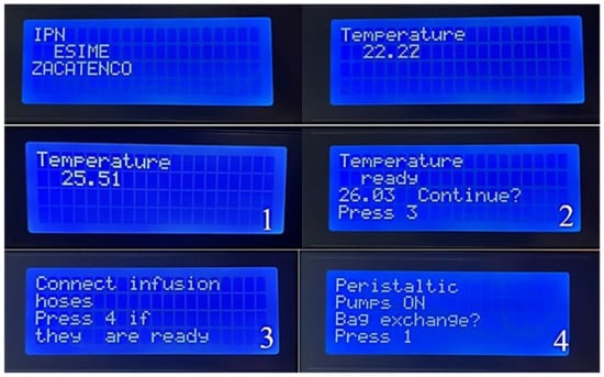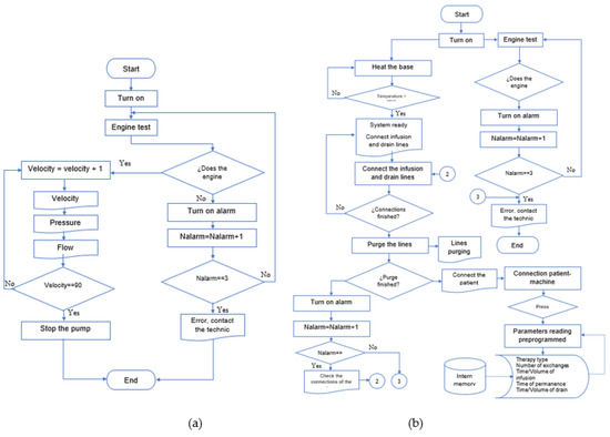 The microcontroller is programmed to execute two algorithms, the first for experimental purposes on the actuator with sensor response and the second to perform infusion, permanence, and drain with the ideal operating range (Figure 8). First, in the cassette operation tests, angular velocity variations are made using the pump motor’s pulse width modulation (PWM) technique. Then, the sensors’ signals are processed to be indicated on an LCD screen. Once the tests are concluded, the parallel pump, the priming of the lines, and the therapeutic cycle process are verified. At the same time, the machine conditions are displayed, and the user conditions the therapy process. The information is the measured variables and timers. Figure 8 describes the algorithm for the cycler prototype.
