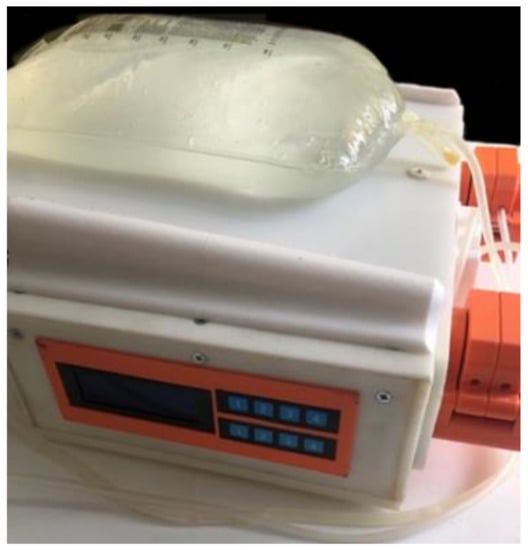 For the selection of the flexible hose, the flow rate and the permissible error values must be considered not to damage the patients during the treatment, the pressure delivered by the peristaltic pump must be approximately ±10 kPa, and the flow rate must be for drainage and for infusion. Typically, Norprene® (Santa Clarita, CA, USA), Tygon® (Santa Clarita, CA, USA), and Marprene® (Santa Clarita, CA, USA) silicone rubber materials are selected. This type of material reduces the risks of tears and ruptures.