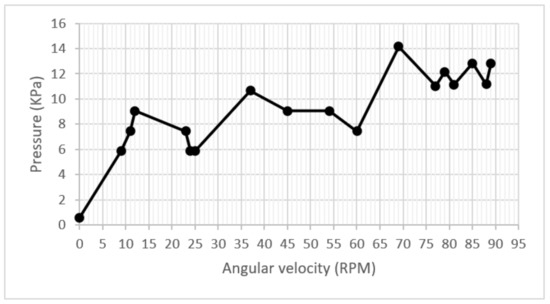 On the same start-up and acceleration test in the pump, a pressure adaptation was shown for each increase in RPM, whose trend increased throughout the test. However, the correspondence rule did not remain constant when fluctuating in the domain of acceleration. During much of the test, the pressure was kept below the maximum allowed value of 12 kPa. The graph showed speeds between 80 and 90 RPM. The pressure fluctuated between 10 and 12 KPa. However, around 64 RPM, 14 KPa obtained a pressure peak. This implies no direct relationship between the increase in speed and pressure, which can be observed in the graph of Figure 12.