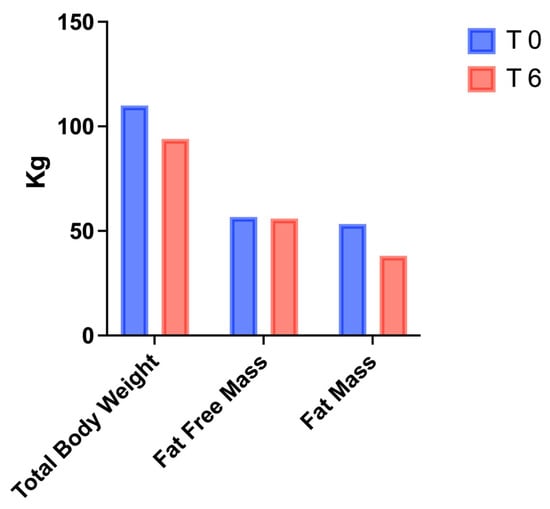 Variations in BW, systolic and diastolic blood pressure, WC, and HC are reported in Table 1: the combination of the VLCKD with IT led to a reduction in BW (110 vs. 94 kg), BMI (36.7 vs. 31.4 kg/m2), BP (135/85 vs. 120/80 mmHg), and WC (110 vs. 98 cm). As shown in Table 2, metabolic parameters were assessed by performing blood tests after the patient’s discharge from subintensive care (T-1), before starting VLCKD + IT (T0), and after 6 weeks (T6). Notably, a reduction in fasting insulin (12 vs. 9 μIU/mL), fasting glycemia (123 vs. 92 mg/dL), the HOMA index (3.6 vs. 2.0), creatinine (0.9 vs. 0.73 mg/dL), triglycerides (145 vs. 82 mg/dL), and LDL cholesterol (104 vs. 73 mg/dL) was observed from T0 to T6, with a parallel increase in HDL cholesterol (40 vs. 50 mg/dL) and vitamin D (23 vs. 29.6 ng/mL). Changes in electrolytes were not observed (data not shown). The average weight loss was nearly 14.5% of the patient’s initial weight, with a reduction in fat mass (53.2 vs. 38 kg) and a concomitant preservation of fat-free mass (56.8 vs. 56 kg), as reported in Figure 1 and Table 3. Improvement in muscle strength and physical performance, as measured by the HG and the CST, was observed at T6 (Figure 2 and Table 3).