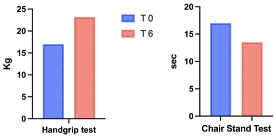 Physical performance measured by the handgrip strength test and chair stand test at the beginning (T0) and at the end (T6) of VLCKD+IT.