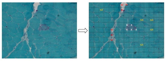 Left panel: ragged red fiber (RRF), hallmark of mitochondrial disorders, in Gomori’s trichrome stain (magnification: 20×; image acquired from the muscle of patient 8). Right panel: it shows the method used to create the dataset for our analysis: each acquired image was subdivided in 165 sub-images (15 × 11). All the sub-images that contain a portion of an RRF were added to the dataset and labeled as “ragged” (R label in the figure, written in white). After that, we arbitrarily collected a similar number of sub-images that do not contain RRFs, labeling them as “not ragged” (NR label, written in orange) and some “waste” sub-images (W label, written in red). The rest of the sub-images were discarded to avoid the unbalancing of the dataset.