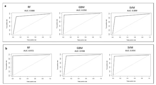 The F1 scores for RF, GBM, and SVM for the waste-tissue classification step were 0.87, 0.91, and 0.89, respectively. GBM exhibited the best F1 score. In terms of other metrics, the accuracies of RF, GBM, and SVM were 0.87, 0.91, and 0.90, respectively (Table 1a). The tuned values of the hyperparameters for each model are shown in Table S2. For each tuned and retrained model, the ROC curve and the AUC value were calculated on the test set. Figure 2a shows ROC curves. The AUCs of the tuned RF, GBM, and SVM were 0.89, 0.95, and 0.90, respectively. The tuned GBM model exhibited the higher AUC value of the test set, and the performance was significantly better than those of the rest models. We selected this model as the best waste-tissue classifier. Table 2a shows the confusion matrix of the test set.