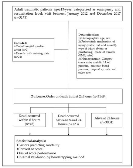 - Sartorius, D.; Le Manach, Y.; David, J.S.; Rancurel, E.; Smail, N.; Thicoipe, M.; Wiel, E.; Ricard-Hibon, A.; Berthier, F.; Gueugniaud, P.Y.; et al. Mechanism, glasgow coma scale, age, and arterial pressure (MGAP): A new simple prehospital triage score to predict mortality in trauma patients. Crit. Care Med. 2010, 38, 831–837. [Google Scholar] [CrossRef]