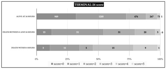 | TERMINAL-24 Score | Death within 8 h | Death between 8 and 24 h | Survival at 24 h | Mortality Rate (%) |